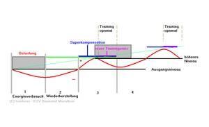 Superkompensation bedeutet, dass der Körper nach einer Belastung im Training nicht nur die Bereitschaft zur Erbringung des gleichen Leistungsniveaus wiederherstellt, sondern im Verlaufe der Erholung die Leistungsfähigkeit über das ursprüngliche Niveau hinaus steigert und der Organismus somit eine Art "Vorratswirtschaft" , indem er sich auf ein höheres Leistungsniveau einstellt, um zukünftige Belastungen ökonomischer zu bewältigen.